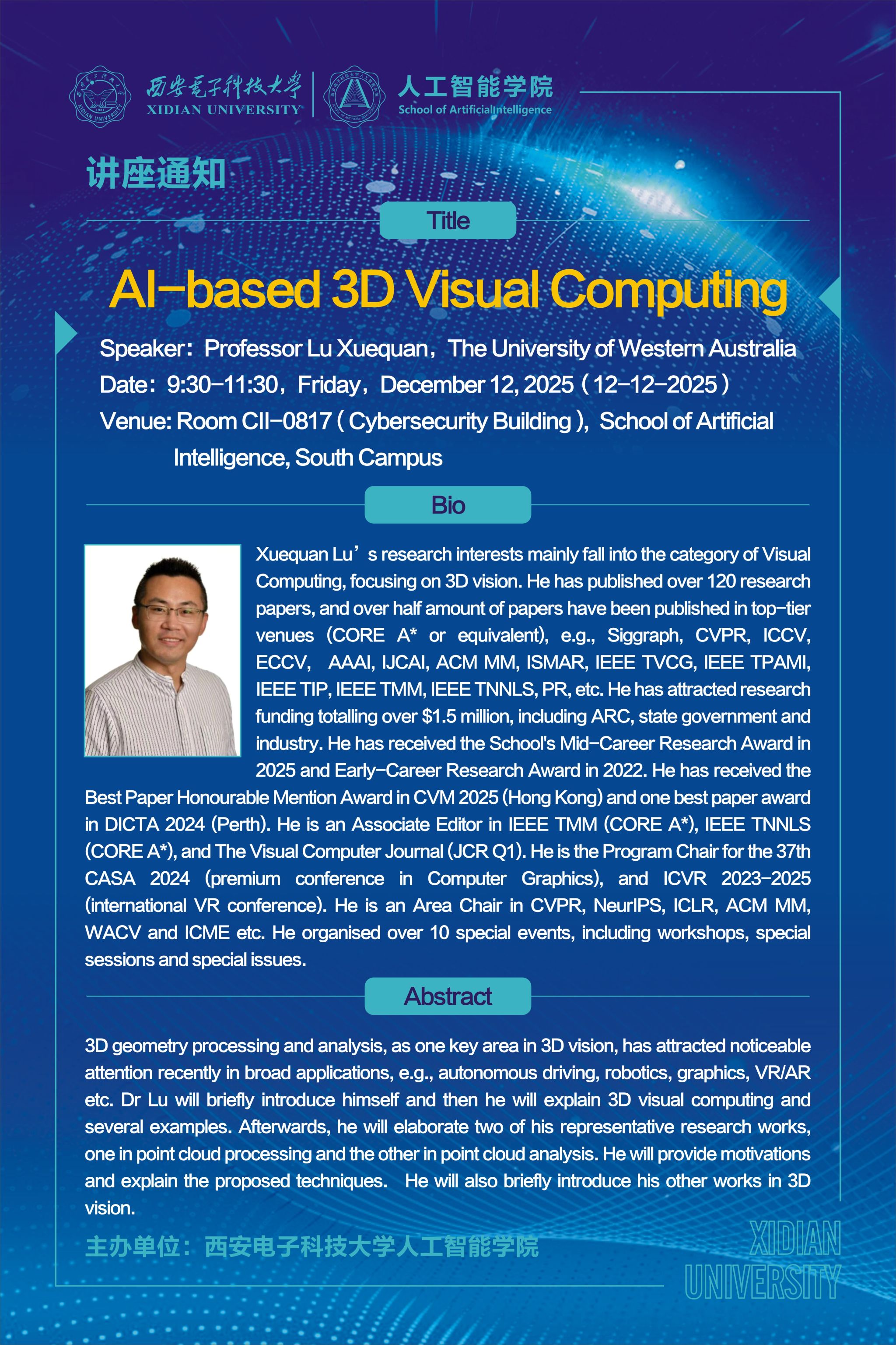 为拓宽学术视野,促进学术交流,学院有幸邀请到鲁学权 教授(澳大利亚 西澳大学)于12月12日(周五)9:30,在南校区beat365官方网站网安大楼CII-0817为我们带来《AI-based 3D Visual Computing》的精彩学术报告,欢迎大家前来聆听、交流!