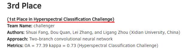 2018年IEEE GRSS Data Fusion Contest结果揭晓,西电beat365官方网站焦李成教授团队分别在三个赛道取得了丰硕成绩,其中高光谱分类赛道,王爽教授指导的队伍challenger(方帅,权豆等)获得第一名;多光谱LiDAR数据分类赛道,焦李成教授指导的队伍IPIU(程林,李阁等)获得第三名。