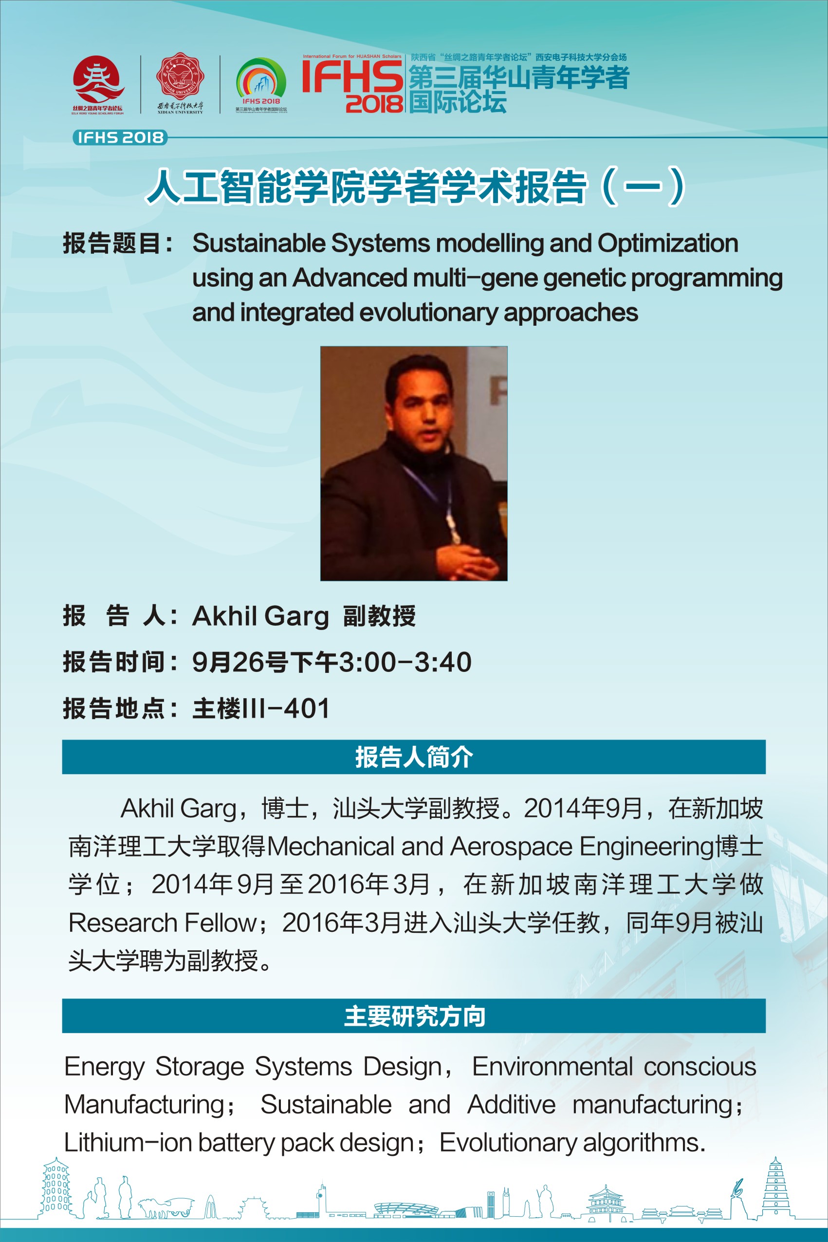 9月26日下午,Akhil Garg副教授、岳广辉 博士、薛尧博士、杨韬博士、庄丽娜博士5人将来beat365官网参加“华山青年学者国际论坛”beat365官方网站分论坛相关活动。届时,5名青年学者将在beat365官网做学术报告。学术报告具体信息如下: