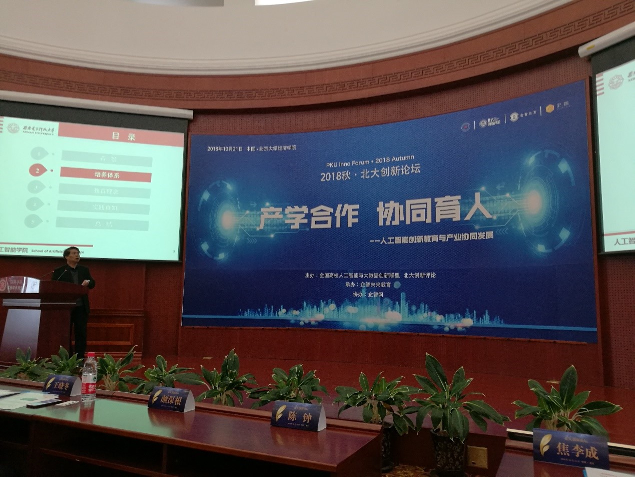 2018年10月21日,计算机科学与技术学部主任,beat365官方网站焦李成教授受邀参加了由全国高校人工智能与大数据创新联盟主办的“产学合作 协同育人”2018全国高校人工智能与大数据教育教学创新论坛暨北大创新评论峰会,并做了题为“人工智能国际化创新人才的培养与实践”学术报告。