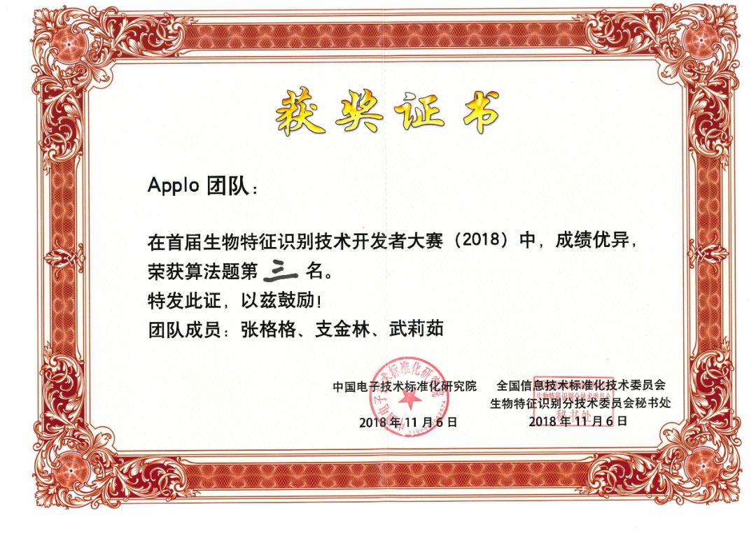 据悉,大赛历时两个多月,吸引了174支队伍,共计320人参加,算法题通过AUC指标对算法的性能进行排名,初赛选取前20进入复赛,Applo团队在初赛阶段就以第5名的成绩,成功入围复赛,复赛阶段,除了AUC指标的算法排名,还需要提交依据GB/T26237.5-2014《信息技术 生物特征识别数据交换格式 第5部分:人脸图像数据》标准生成“人脸数据记录单元”用于标准符合性测试,在通过标准符合性测试的团队中,取前3入围决赛,参与现场答辩,以复赛排名70%和答辩30%的比例进行最终成绩的加权,经过激烈的角逐,beat365官方网站硕士研究生张格格所在队伍Applo取得了大赛季军,颁奖典礼在11月6日举办的全国信标委生物特征识别分委会(TC28/SC37)2018年全会上作为会议上的一个重要环节进行,与会领导为西电智能学子颁发获奖证书。