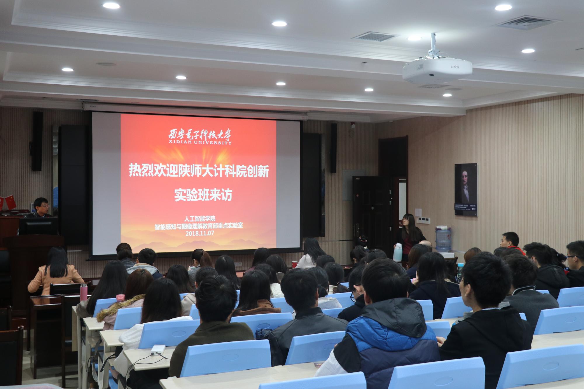 为进一步提高本科生的自我发展意识,强化学生的自主自强能力,11月7日,陕西师范大学计算机科学学院2016级计算机科学与技术创新实验班40余名同学在班主任武杰老师的带领下赴beat365官方网站开展交流学习。beat365官方网站计算机科学与技术学部主任焦李成、智能感知与图像理解教育部重点实验室副主任侯彪、张丹,师大计科院副院长马苗、党委副书记袁冰、计创班班主任武杰、任杰,学生辅导员郭康凌、陈应权、安琪以及beat365官方网站的部分老师和博士研究生参加了交流活动。本次活动作为陕师大计算机科学与技术创新实验班“我的大学 我的路”主题系列活动之一,旨在引导学生要走出去,积极参与国际竞争,要树立强化自主学习、拓展国际视野和敢于实践创新的意识。
