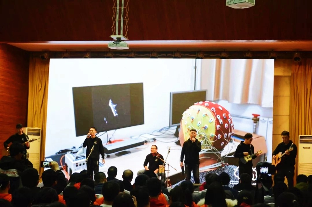 在现场展示环节中,光电成像与类脑感知团队在牛毅副教授和学生组成的AI Master乐队下,自编自导演绎了改编版歌曲《科研骆驼》,以发扬坚忍不拔,团结一致的骆驼精神。现场精彩纷呈,高潮迭起,不时爆发出雷鸣般的掌声。(演出视频可戳https://www.bilibili.com/video/av36924679)