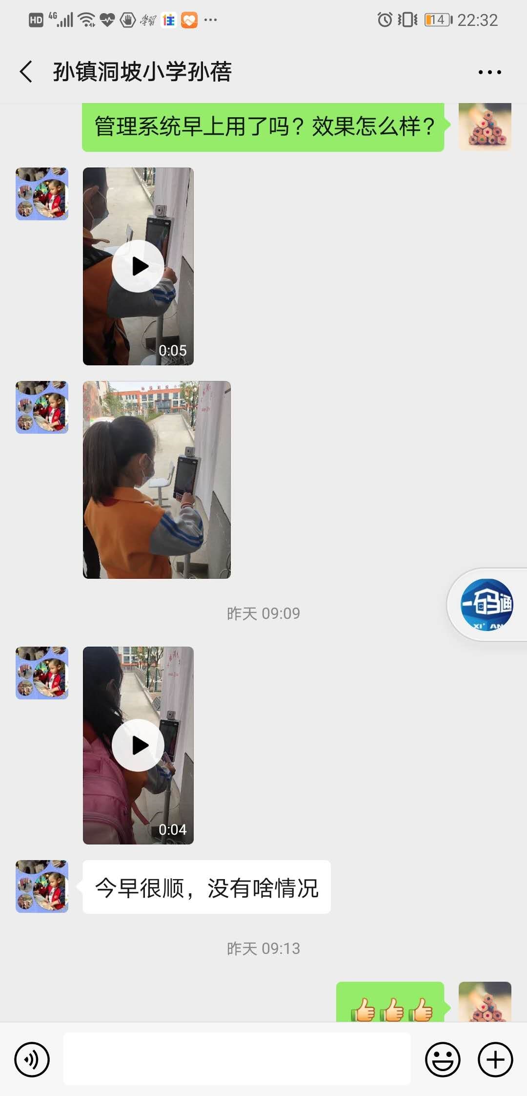 4月19日,团队成员再次赴孙镇洞坡小学实地安装、部署定制化热成像系统,就系统调节、基本操作、后台管理等方面向小学相关负责老师进行了培训和答疑,并组织了实操演练。4月20日小学复学返校第一天,该校园智能管理系统成功发挥作用,确保了复学返校有序高效开展,得到了师生的一致认可。