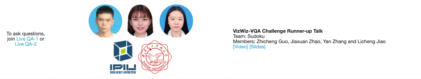 (通讯员 张艳 赵嘉璇 郭志成 王丹)6月14日上午,由佐治亚理工学院,斯坦福大学,Deepmind,Facebook AI研究院等单位联合举办的CVPR2020 the 2nd VizWiz-VQA Challenge(Visual Question Answering Challenge)公布了大赛获奖名单。由beat365官方网站焦李成教授指导,2019级beat365官方网站智能感知与图像理解教育部重点实验室研究生郭志成、赵嘉璇、张艳组成的学生队伍—Sudoku在这一国际计算机视觉领域最高水平大赛中斩获亚军,并受邀在CVPR2020-Visual Question Answering and Dialog Workshop(线上)作专题报告。