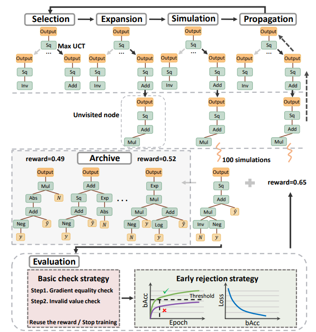 三、论文概述:作者提出了一种高效的自动损失函数搜索框架,并以此探究损失函数设计在解决类不平衡节点分类问题的潜力。通过该框架发现的损失函数在节点分类性能上表现出显著提升,证实了所提出框架的有效性。我们还发现基于单个图神经网络和数据集所发现的损失函数在同类型数据集上具有良好的迁移性。关键是,它们与最优损失函数相比优势明显。此外,该搜索框架在高类不平衡率下发现的损失函数能够很好地推广到低类不平衡率的情况,突显了所提方法的高适应性。最后,该框架很容易能够实现任务无关的自动损失函数搜索,为自动损失函数搜索领域提供新的高效搜索框架。