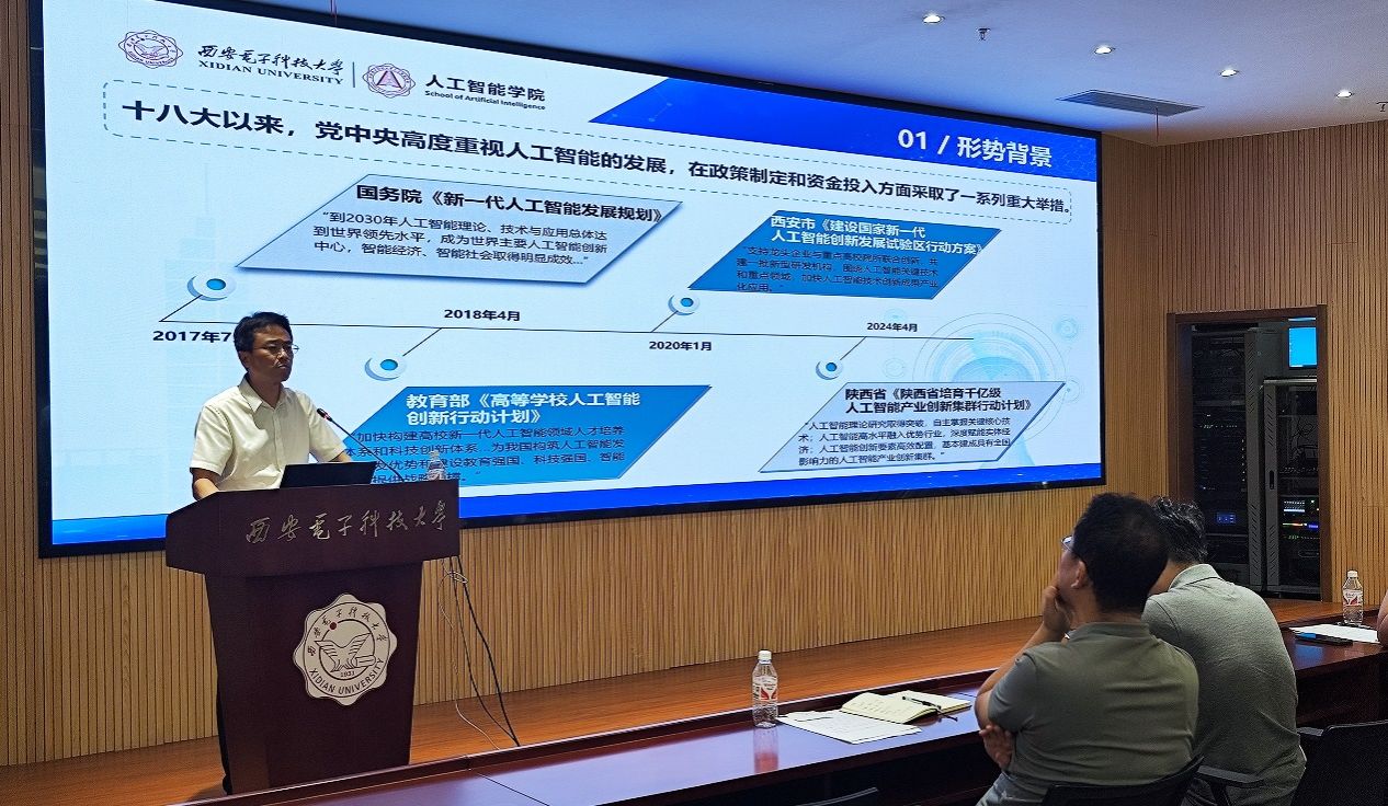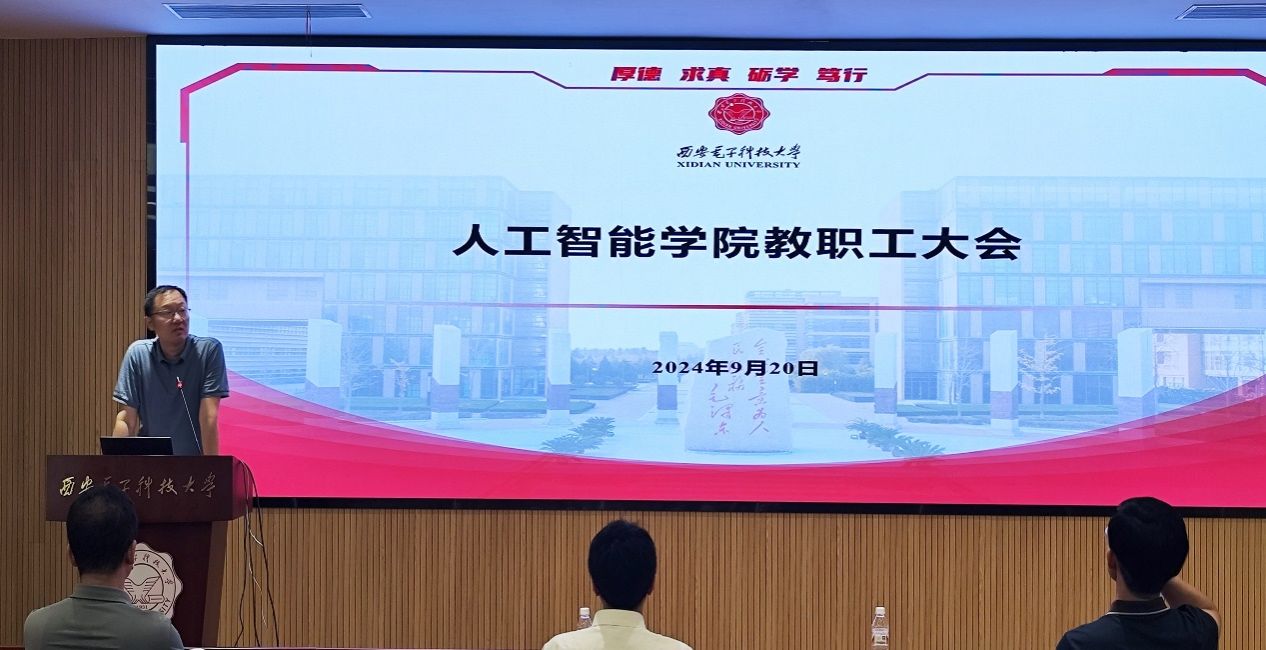 执行院长侯彪向全院教师传达学校2024下半年工作会议精神,就学院上半年的工作进行了全面而深入的总结回顾,并对下半年的工作重点进行了详细部署。他紧密结合国家人工智能发展的宏观趋势,阐述了学院作为高等教育领域人工智能人才培养与科研创新的重要基地所肩负的历史使命。他系统分析了学院在人才培养、科学研究、学科发展、师资队伍建设等方面做出的成绩与存在不足,并针对性地提出了下半年及未来一段时间的发展规划。