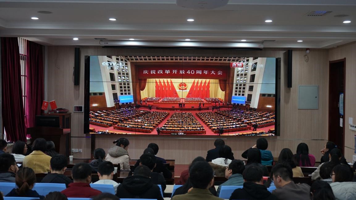 西电新闻网讯(通讯员 赵蕾)庆祝改革开放40周年大会18日上午10时在人民大会堂举行,中共中央总书记、国家主席、中央军委主席习近平出席大会并发表重要讲话。beat365官方网站组织党员干部和广大师生观看庆祝改革开放40周年大会,观看人员包括党委书记魏峻,智能感知与图像理解教育部重点实验室副主任侯彪教授,党委副书记高晖,副院长马晶晶,全体老师和各学生党支部代表。