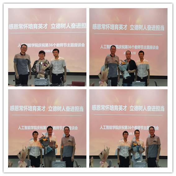 随后,学院老教授分享讲述了从教数十年来的感悟。刘芳教授亲切地讲道,人工智能学科曾陷入了低谷期,度过了一段非常艰难的时光,是众多老教授们不懈努力和始终如一的坚持,让这门学科保持着生命力,如今终于迎来了春天,希望广大中青年教师能抓住机遇,再创辉煌。吴建设教授感谢学院组织此次座谈会,让大家能欢坐一堂交流分享。他表示,从教二十多年是一条漫长的路,付出很多也收获颇丰,犹记得毕业那年留校任教的同学并不多,如今再回首,他庆幸自己的选择,因为感受到了作为教师的快乐和幸福。与会教师为老教授们的真诚付出热烈鼓掌,为了感谢他们的辛勤耕耘,学院特地为老教授们颁发了纪念奖杯和礼物。