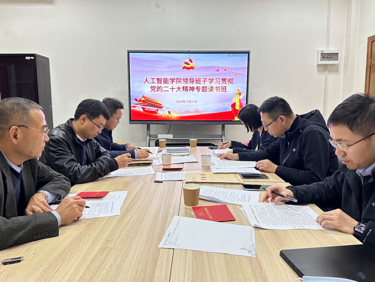 学院领导班子成员在个人自学《党的二十大报告辅导读本》《党的二十大报告学习辅导百问》等辅导资料的基础上,集体原原本本、逐字逐句地研读党的二十大报告,深入学习党的二十大精神和习近平总书记在中央政治局第一次集体学习时的讲话精神,依次领读党的二十大报告原文,并分四个专题开展集中研讨交流。